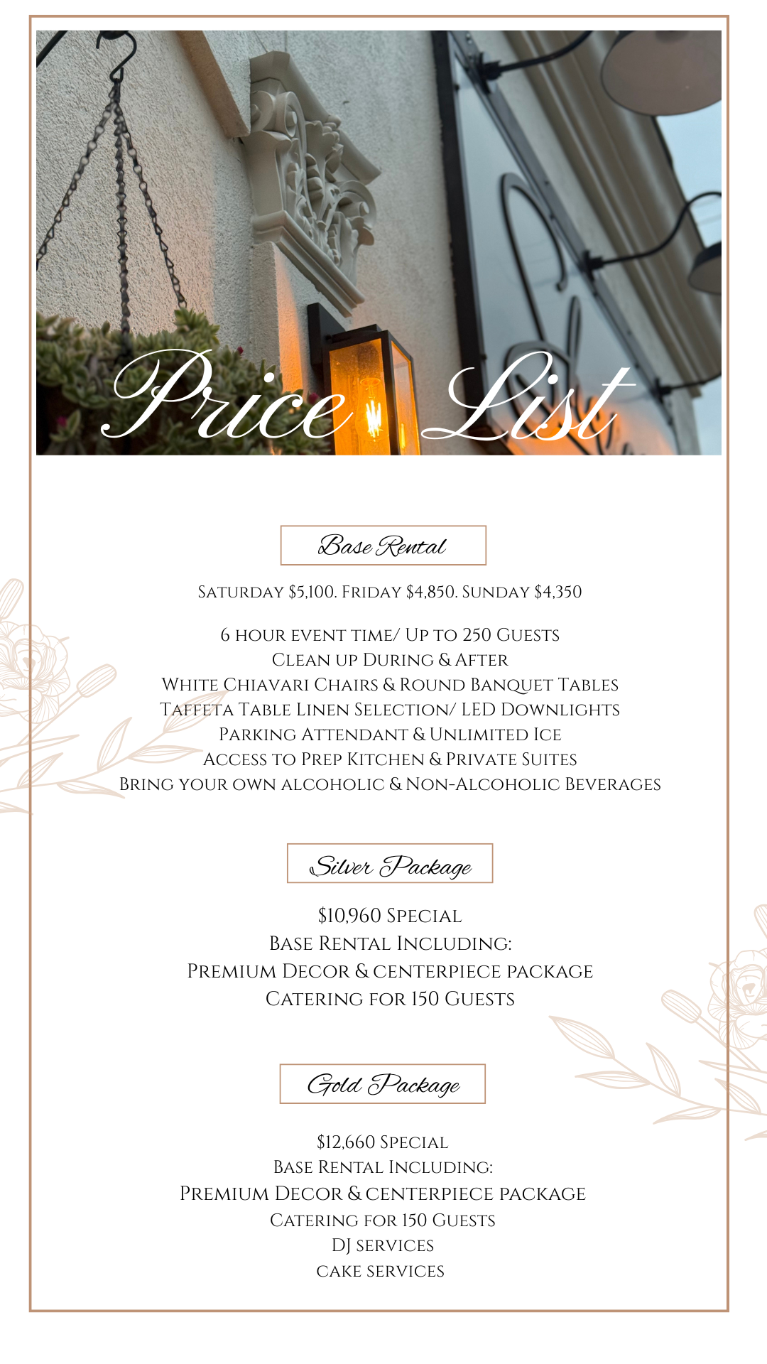 Our venue accommodates up to 250 guests and features customizable floor plans. Reach out today to book your tour and see how we can help make your event unforgettable!